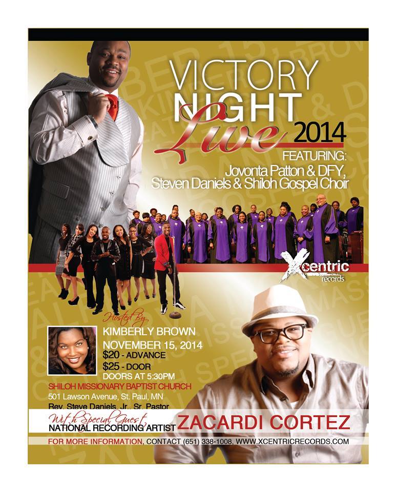 November 15, 2014 Victory Night Live 2014 Hosted by Kimberly Brown – Featuring Jovonta Patton & DFY – Steven Daniels & Shiloh Gospel Choir – Guest Soloists Alfred “AJ” Harris & Marva McKinnley of MS Mass Choir – With Special Guest, National Recording Artist Zacardi Cortez share